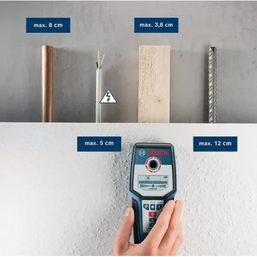 Simple detection for safer work – the detector GMS 120 Professional is the favourite multi-detector in its class. Featuring automatic calibration, the tool avoids application errors, making it ideal for confident work. The tool delivers accurate measuring results for metal and live wire detection in various wall types and, specifically, wooden studs in the drywall mode.